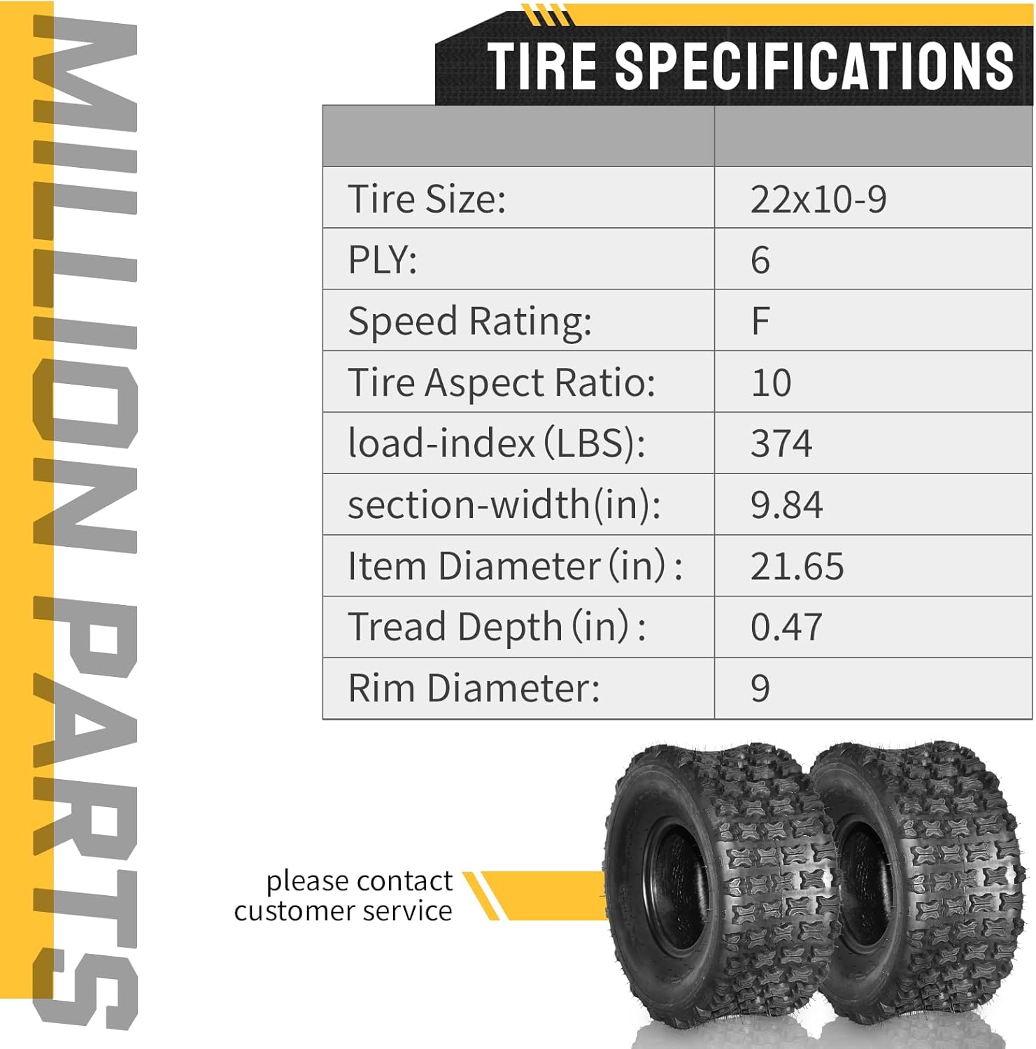 Tire size: Set of 2 22x10-9 ATV/UTV Tires, quantity:2,Item Diameter(in):21.65,section-width(in):9.84,Tread Depth(in):0.47,Rim Diameter(in): 9, Rim width(in):8,load-index(LBS):374,PSI:14,Speed Rating:F,Construction Type:B,TT/TL:Tubeless