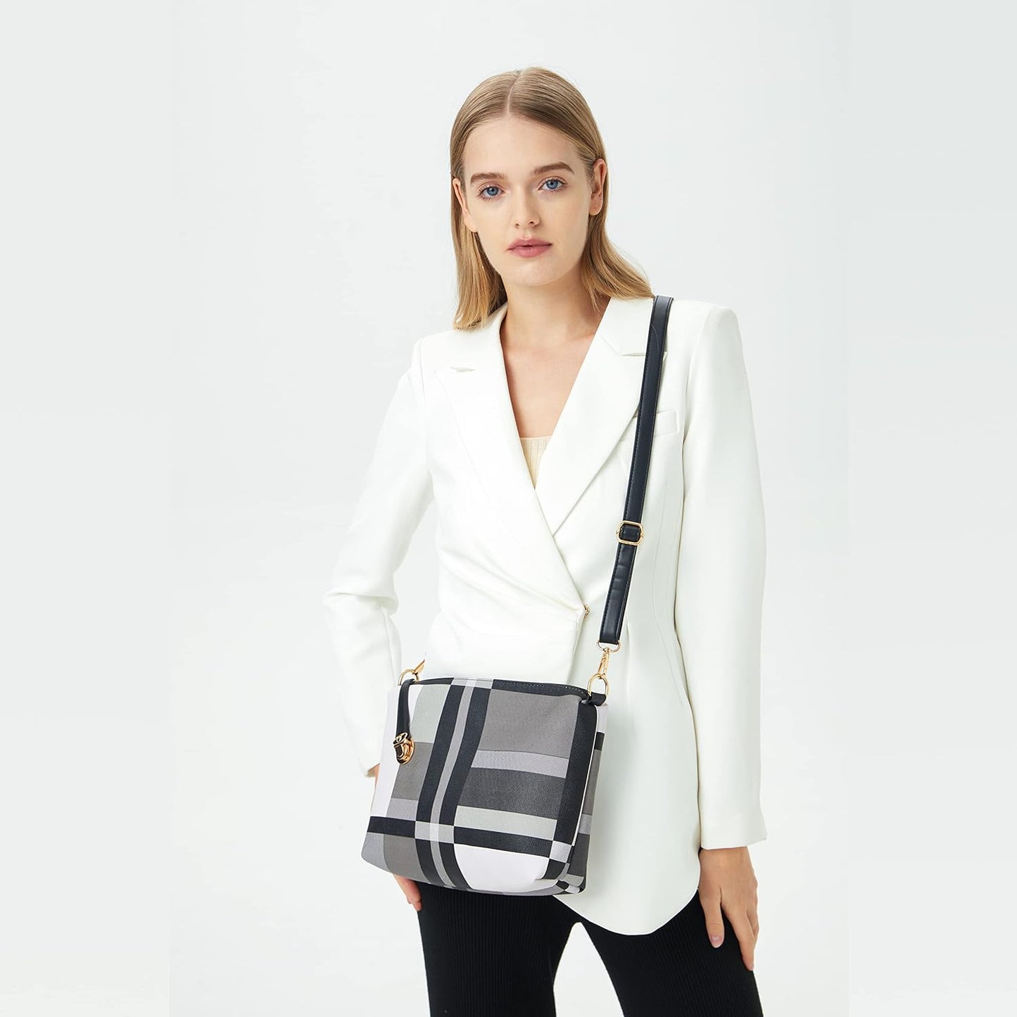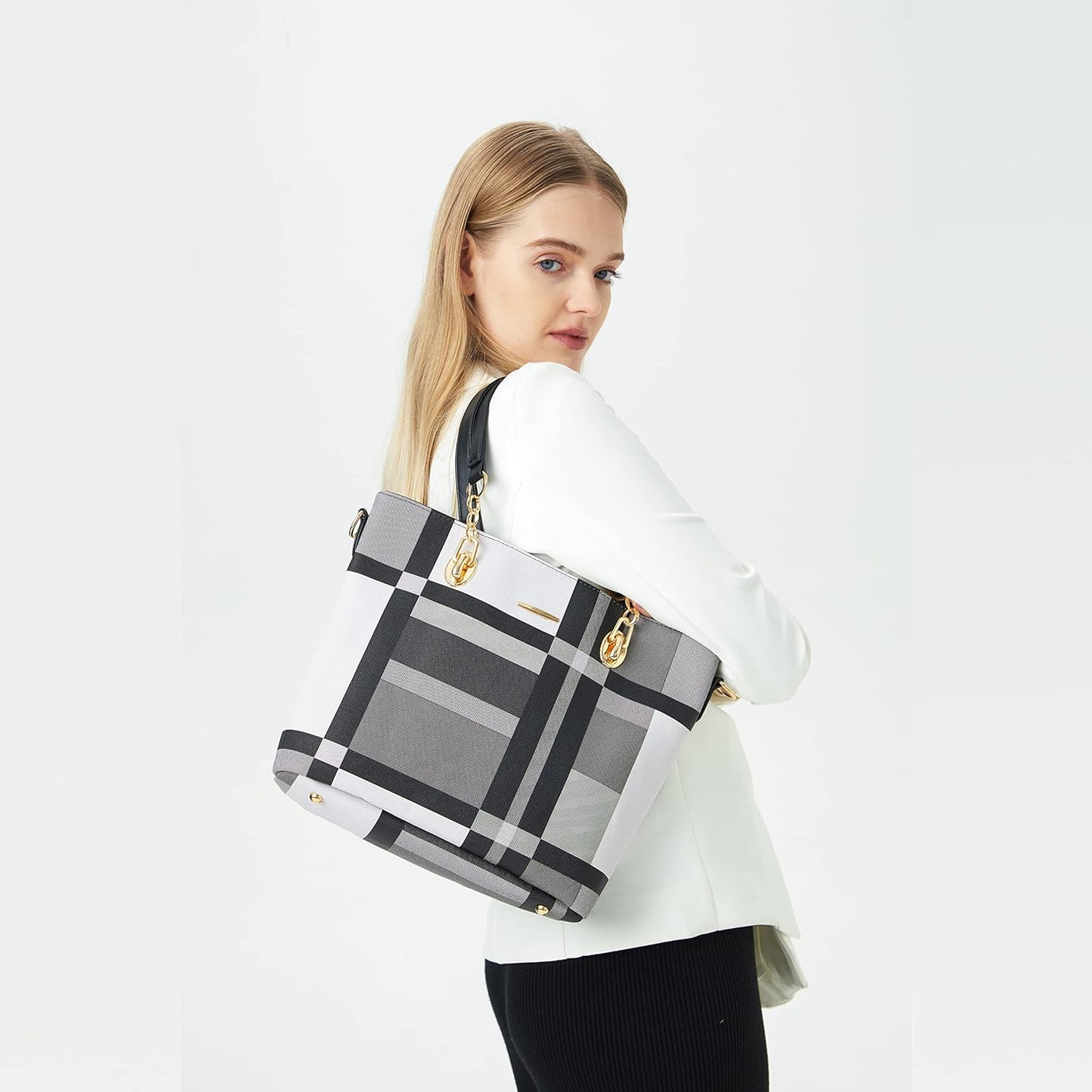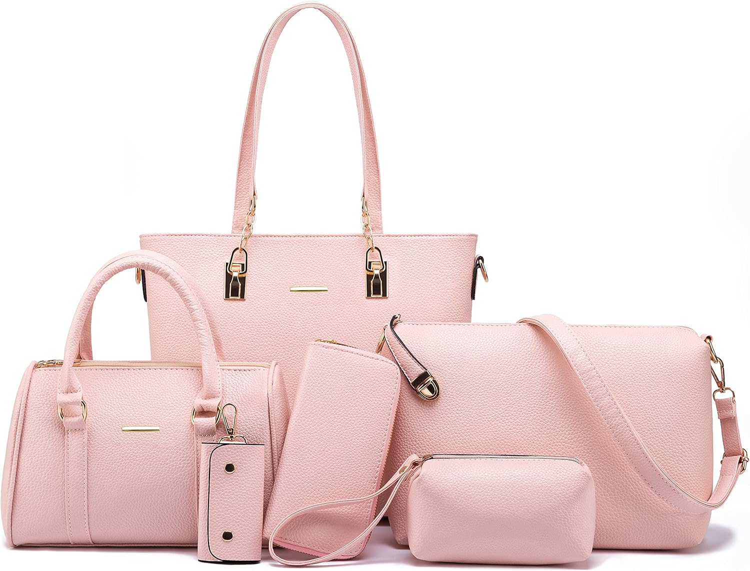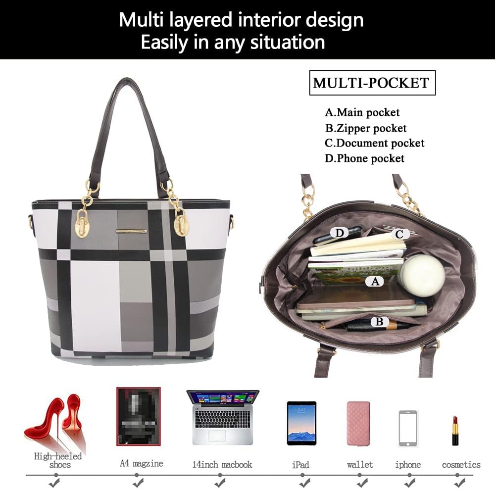 Multi layered interior design:you can easily in any situation.Large tote bag can hold 14 inch Laptop or tablet,A4 documents or books, and your favorite high heels.Satchel shoulder bag can hold coin purse,long wallet,sunglasses,umbrella,cosmetics and other items.Clutch purse can hold your keys,lipstick,and other little items.