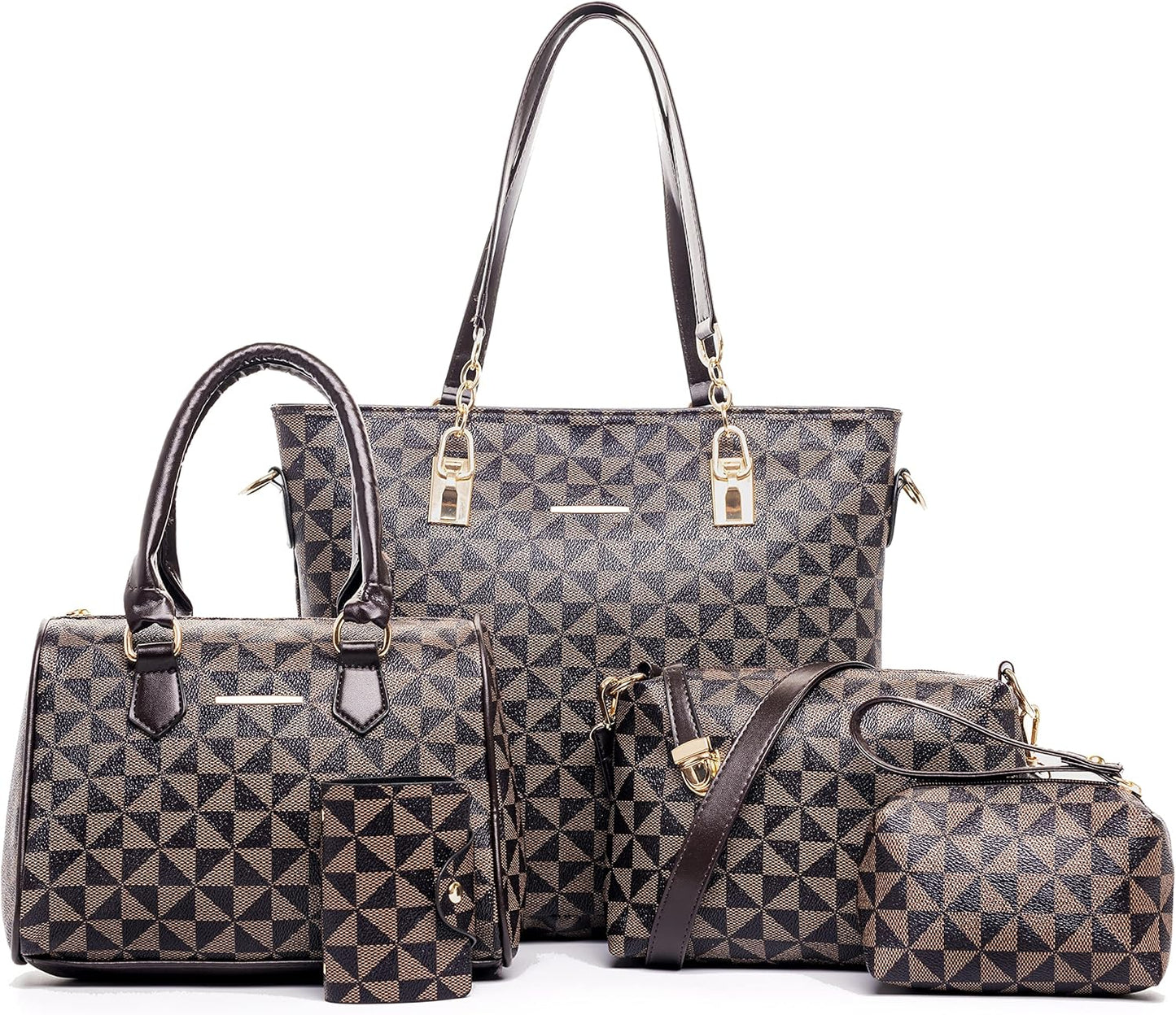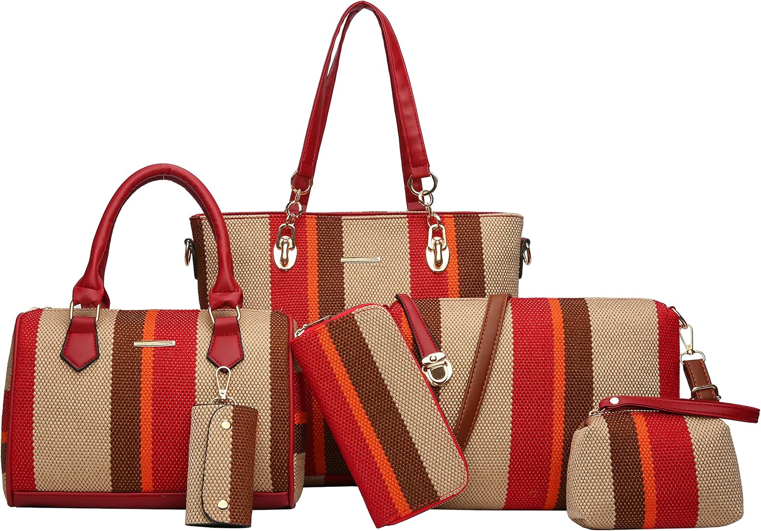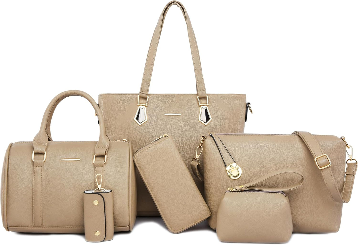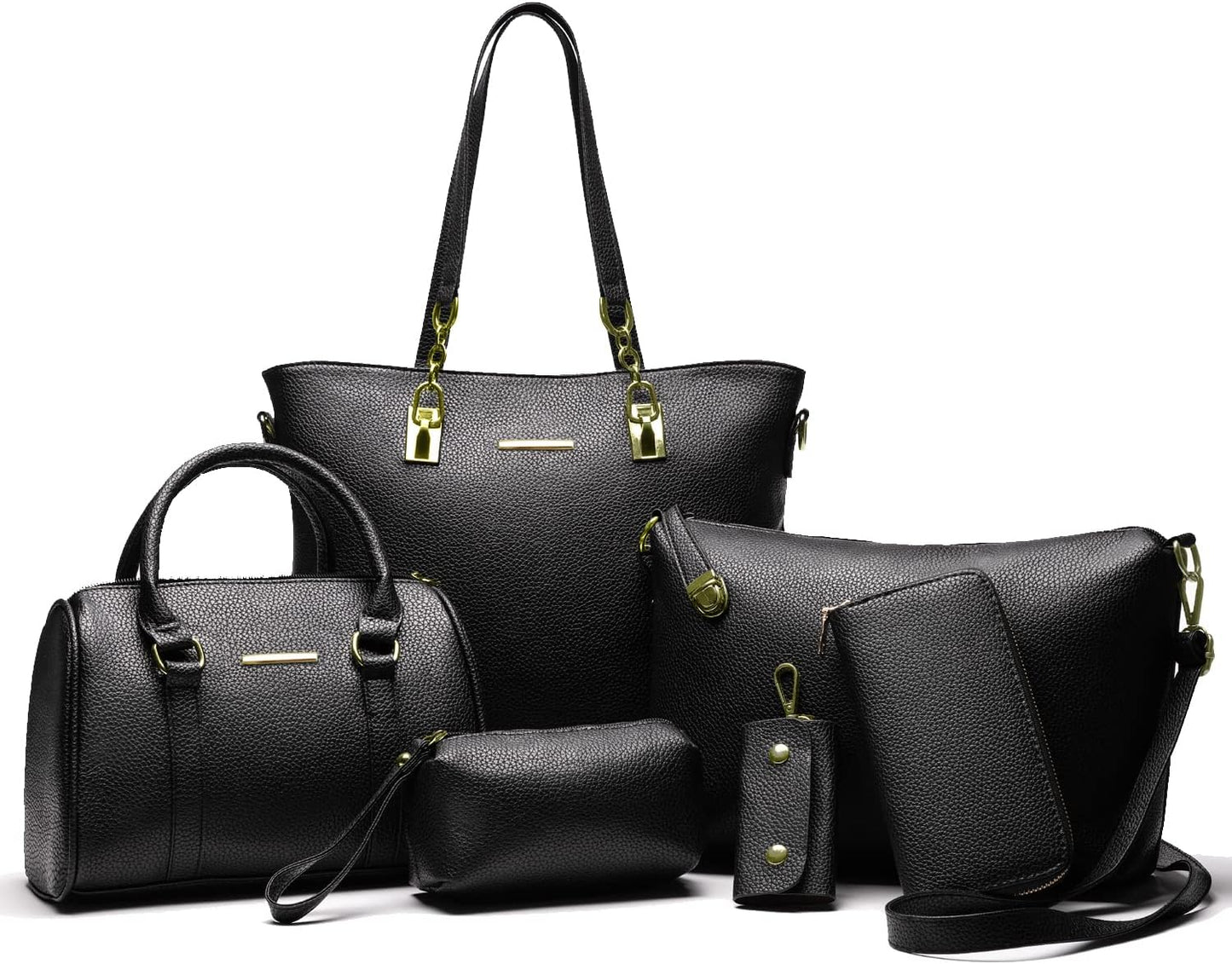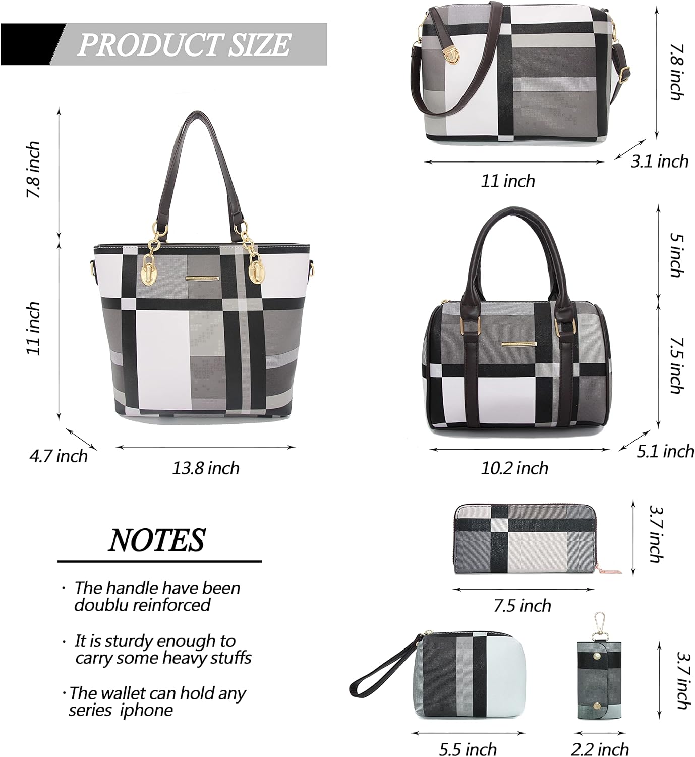 Size: Large tote bag:13.8"L x 4.7"W x 11"H;Middle tote bag:10.2"L x 5.1"W x 7.5"H;Shoulder bag:11"L x 3.1"W x7.8"H;Clutch:5.5"L x 3.7"H;Purse:7.5"L x 3.7"H; Key holder:2.2"L x 3.7"H.
