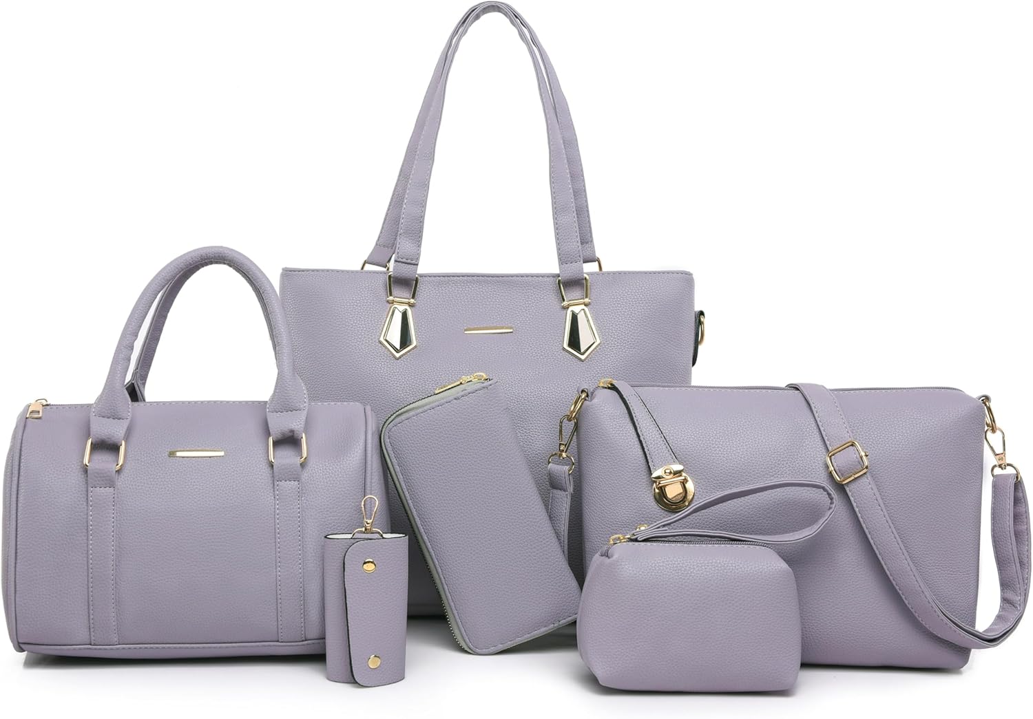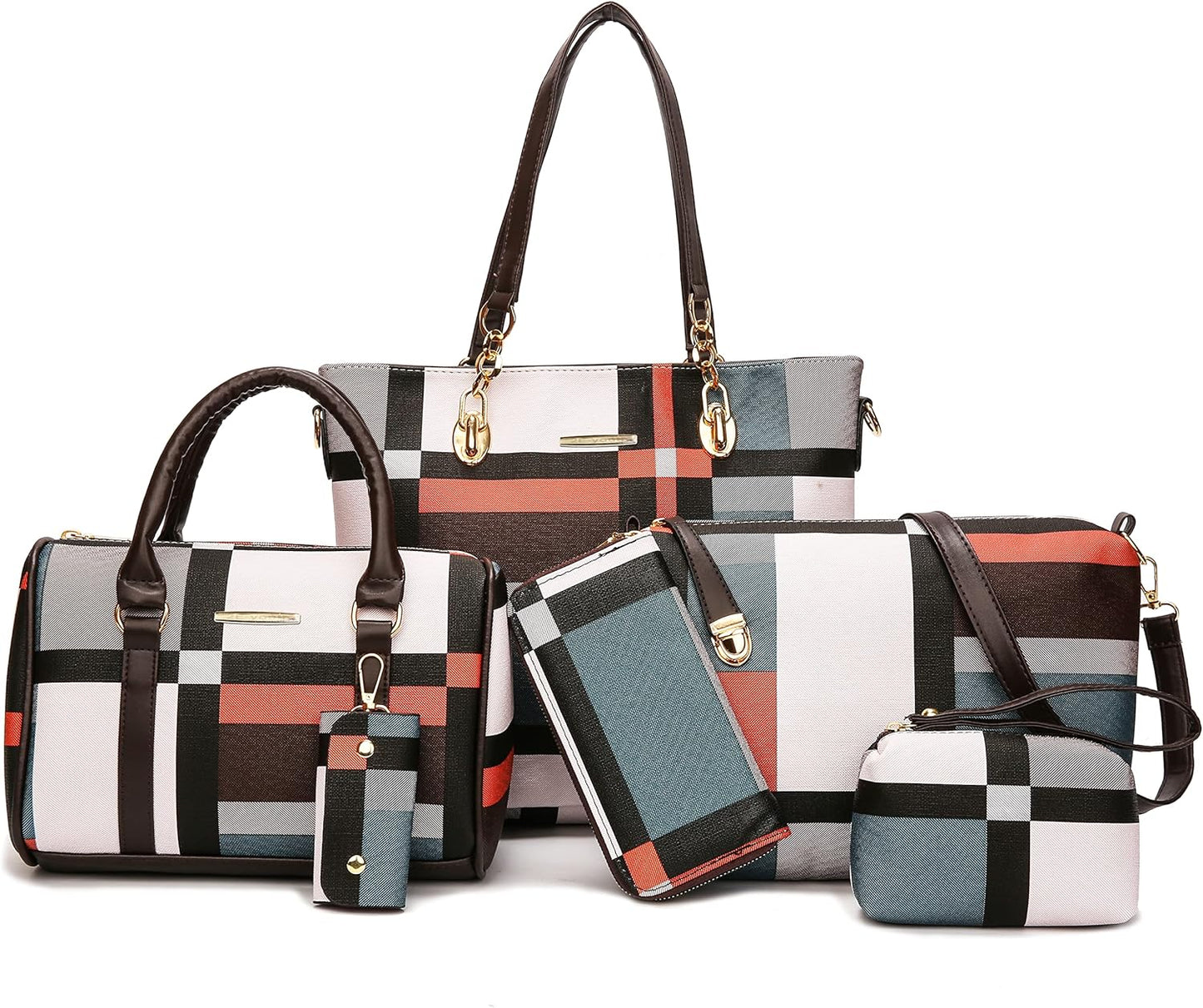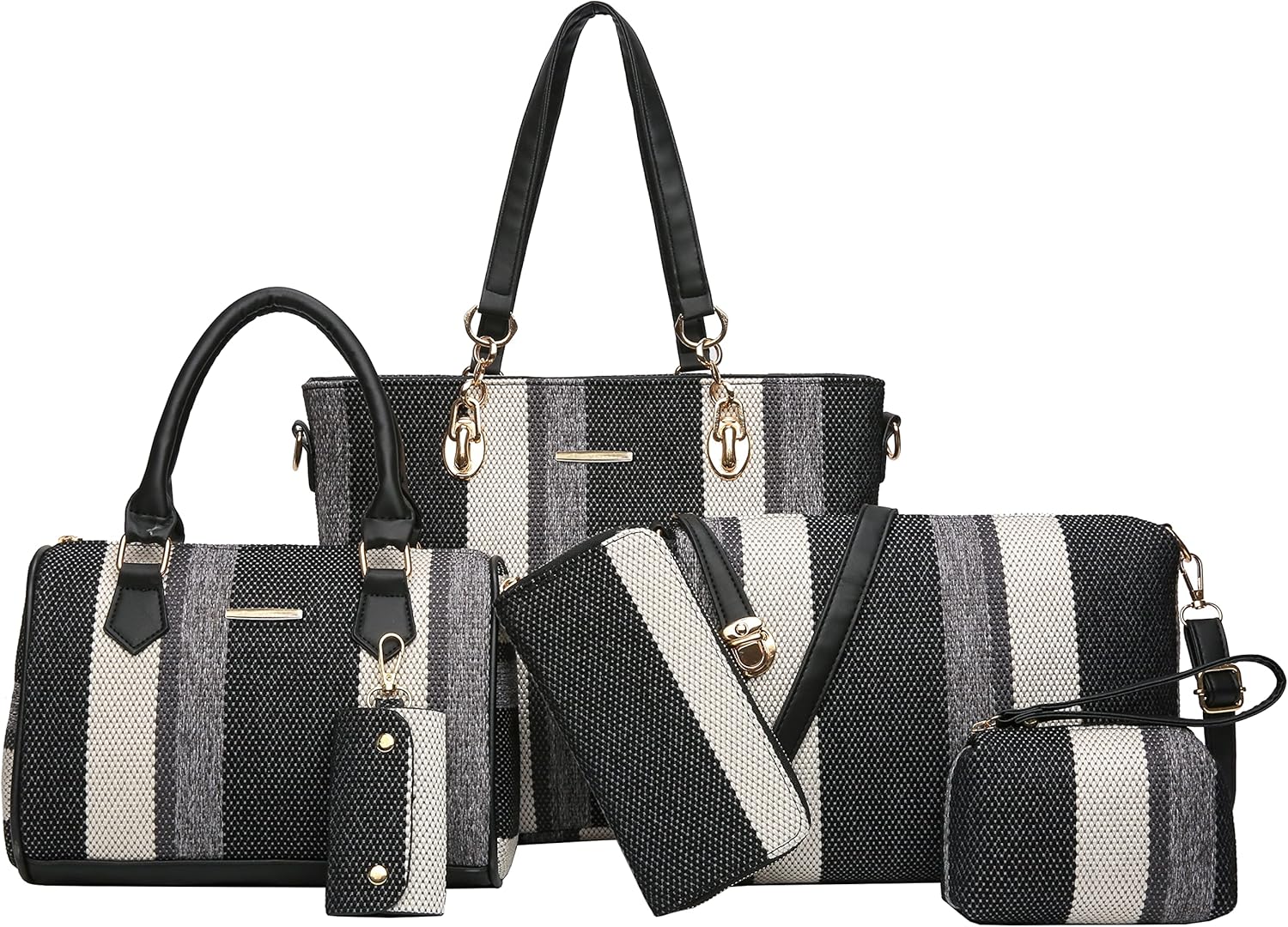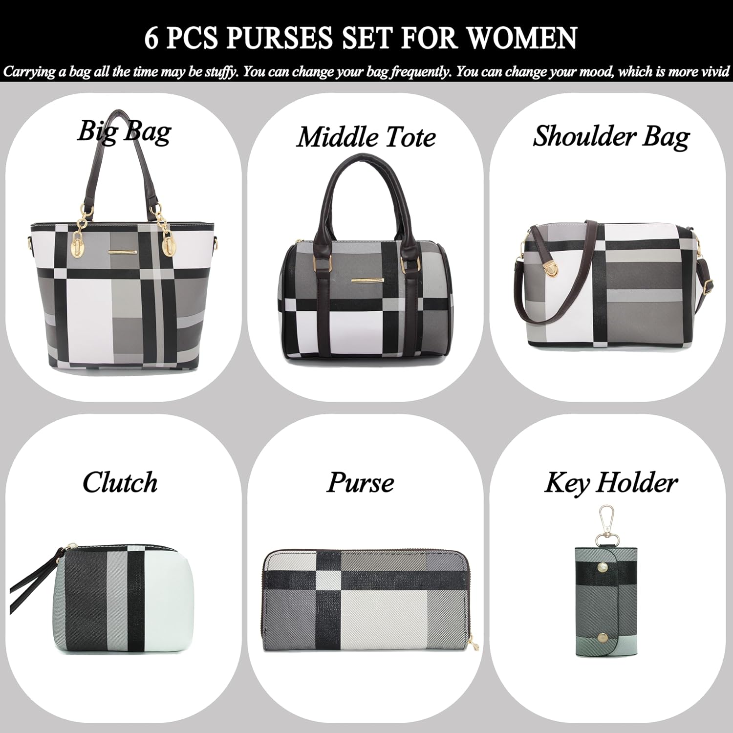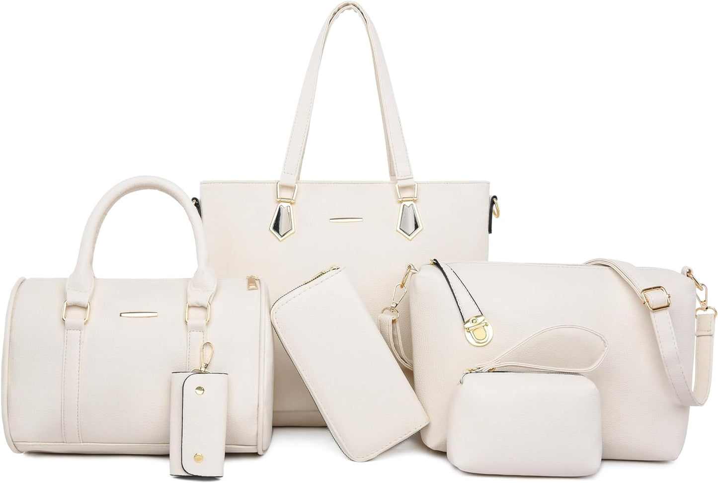 Size: Large tote bag:13.8"L x 4.7"W x 11"H;Middle tote bag:10.2"L x 5.1"W x 7.5"H;Shoulder bag:11"L x 3.1"W x7.8"H;Clutch:5.5"L x 3.7"H;Purse:7.5"L x 3.7"H; Key holder:2.2"L x 3.7"H.
