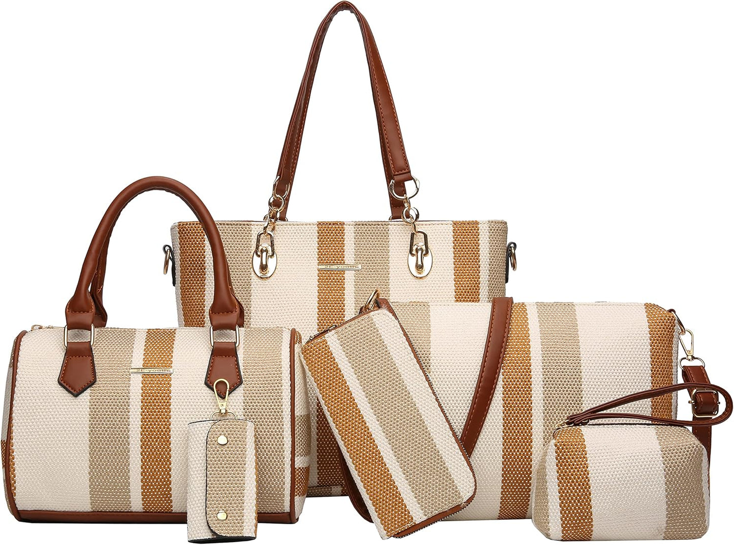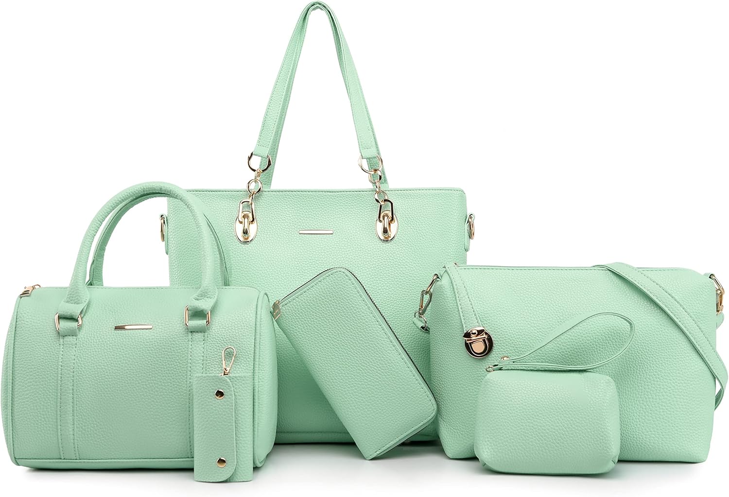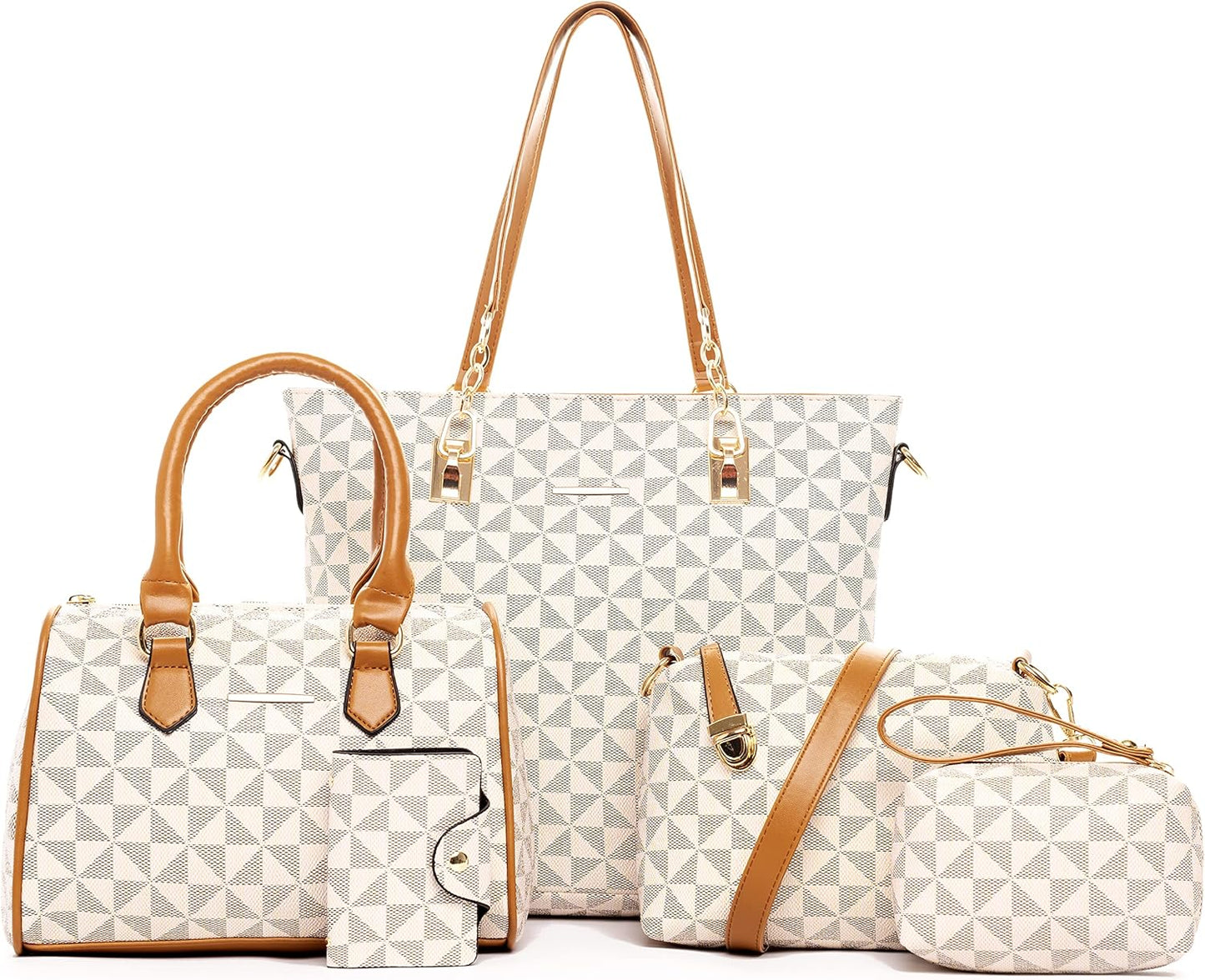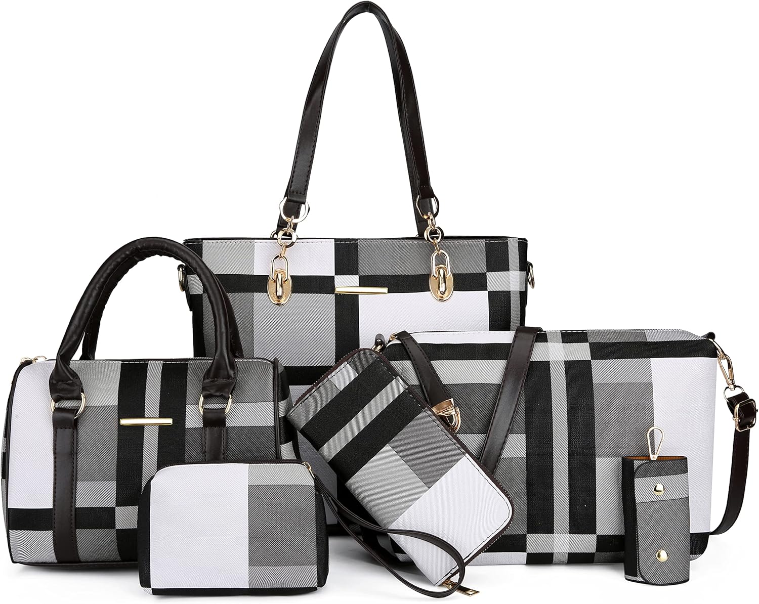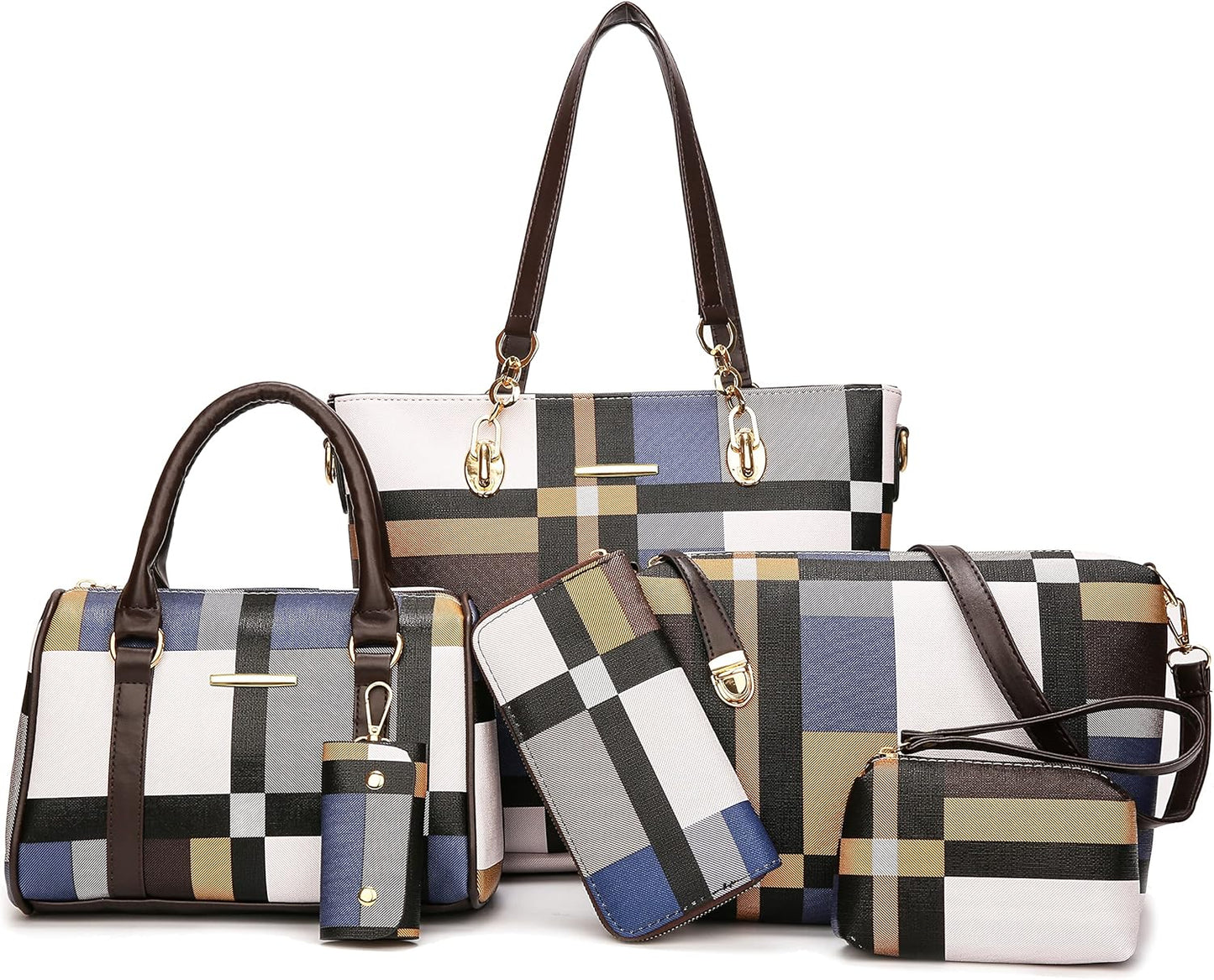 Size: Large tote bag:13.8"L x 4.7"W x 11"H;Middle tote bag:10.2"L x 5.1"W x 7.5"H;Shoulder bag:11"L x 3.1"W x7.8"H;Clutch:5.5"L x 3.7"H;Purse:7.5"L x 3.7"H; Key holder:2.2"L x 3.7"H.