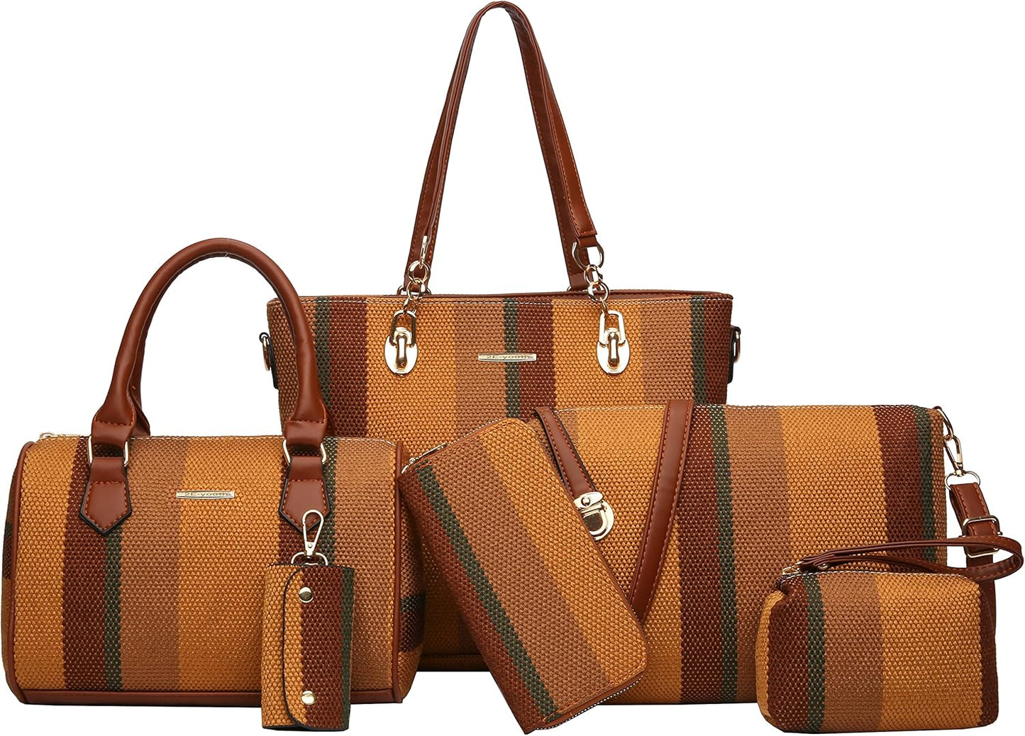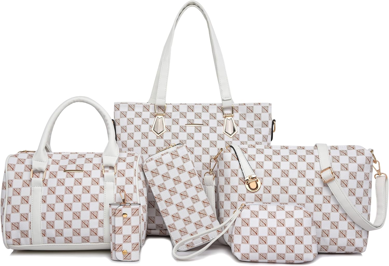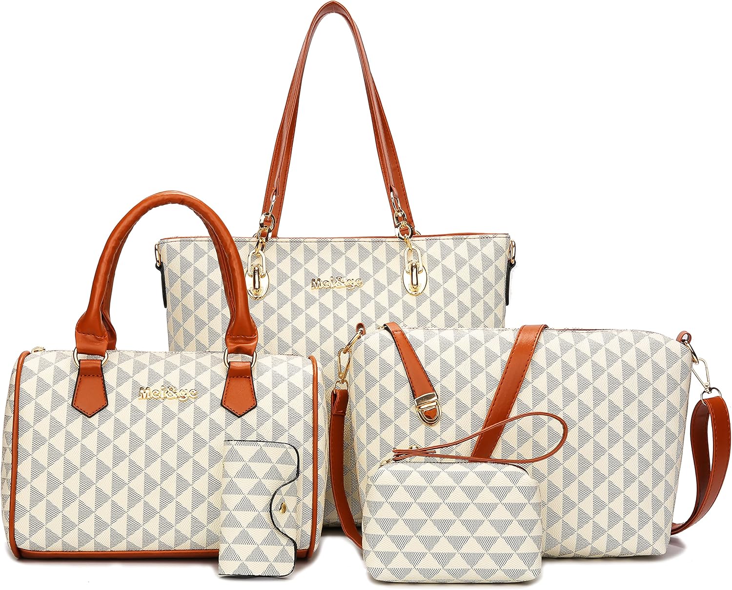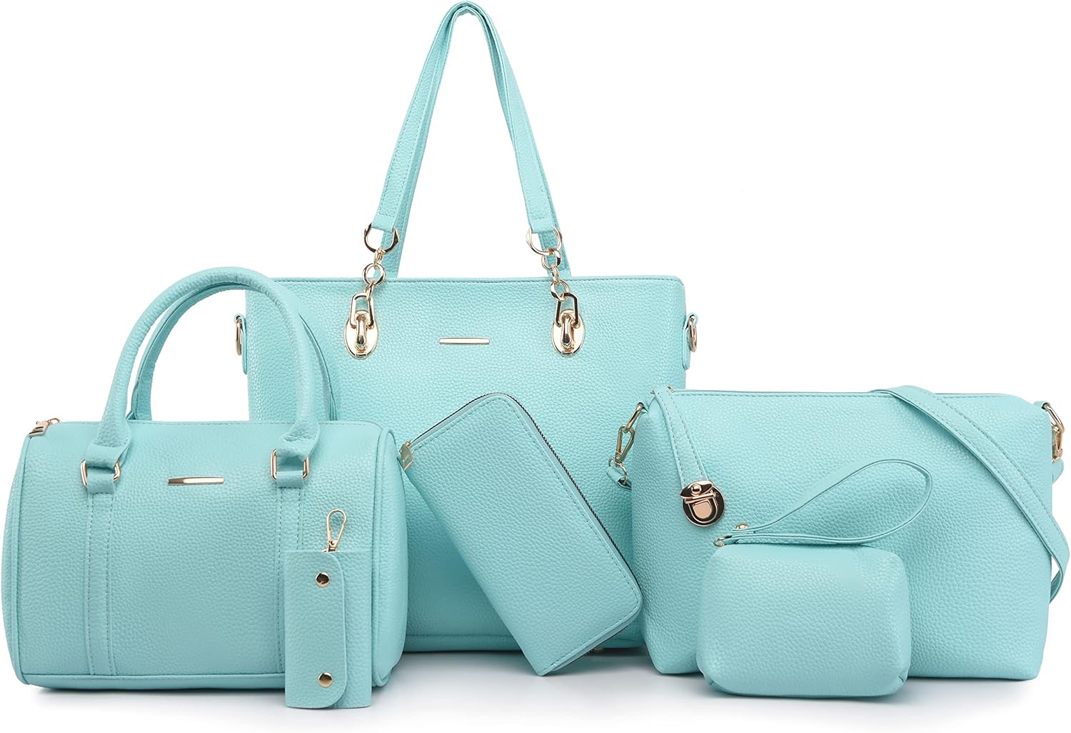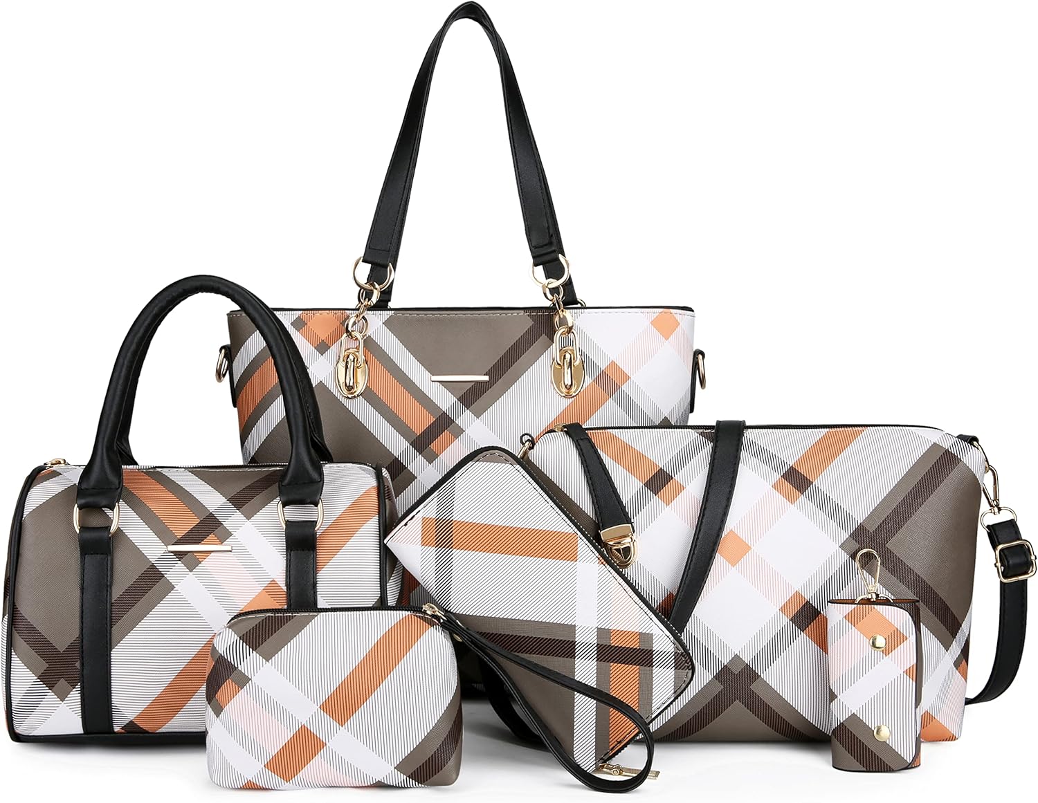 Size: Large tote bag:13.8"L x 4.7"W x 11"H;Middle tote bag:10.2"L x 5.1"W x 7.5"H;Shoulder bag:11"L x 3.1"W x7.8"H;Clutch:5.5"L x 3.7"H;Purse:7.5"L x 3.7"H; Key holder:2.2"L x 3.7"H.