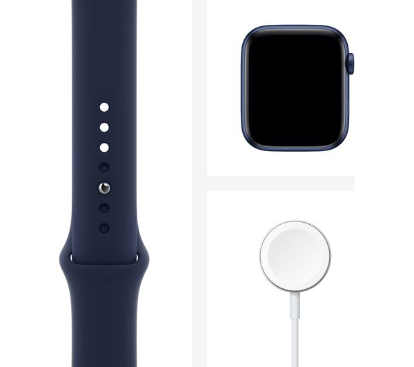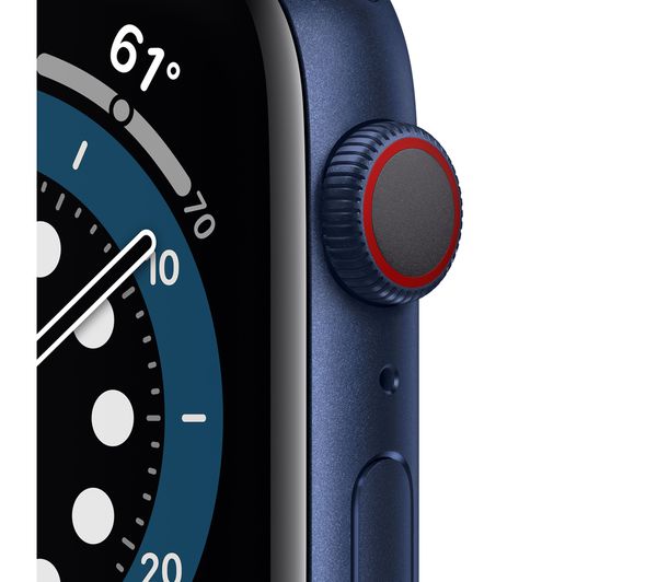 APPLE Watch Series 6 Cellular - Blue Aluminium with Deep Navy Sports Band, 44 mm, Tracks sports / steps / distance / calories / sleep, Monitors heart rate with ECG / VO2 Max / blood oxygen, Battery life: Up to 18 hours, Water resistant & swimproof, GPS, Compatible with iOS, Cellular / WiFi / Bluetooth.