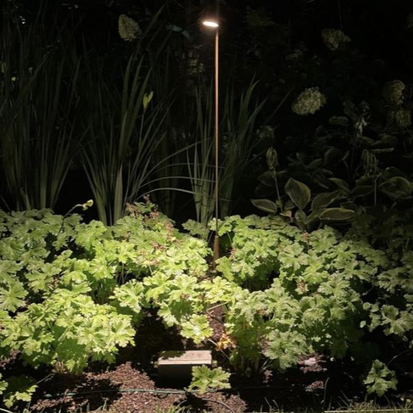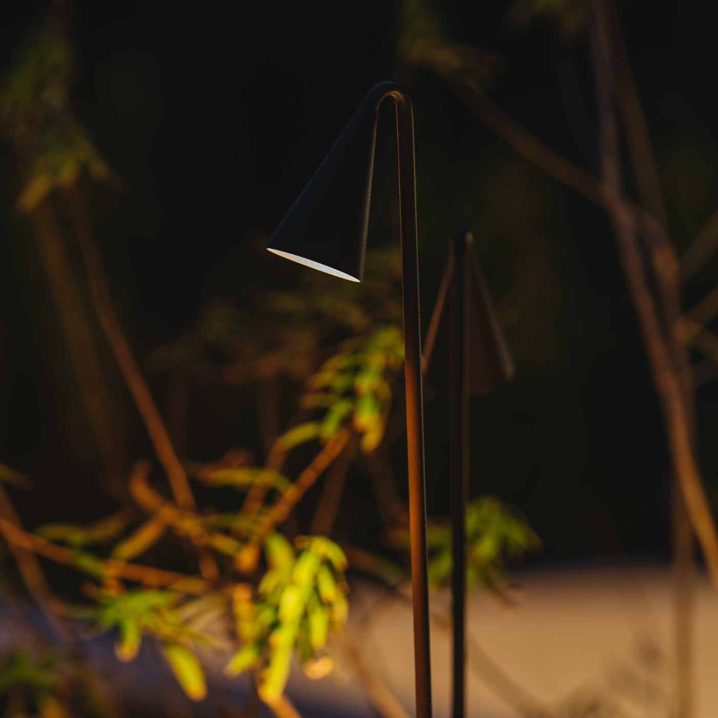 Gentle, small cone shade on a long, slender linear stem that arches downwards in a charming way. Produces a beautiful wide pool of downwards light with minimal glare. Mounts with a spike with an optional plug. 2700K or 3500K. IP64. On/Off (not dimmable).