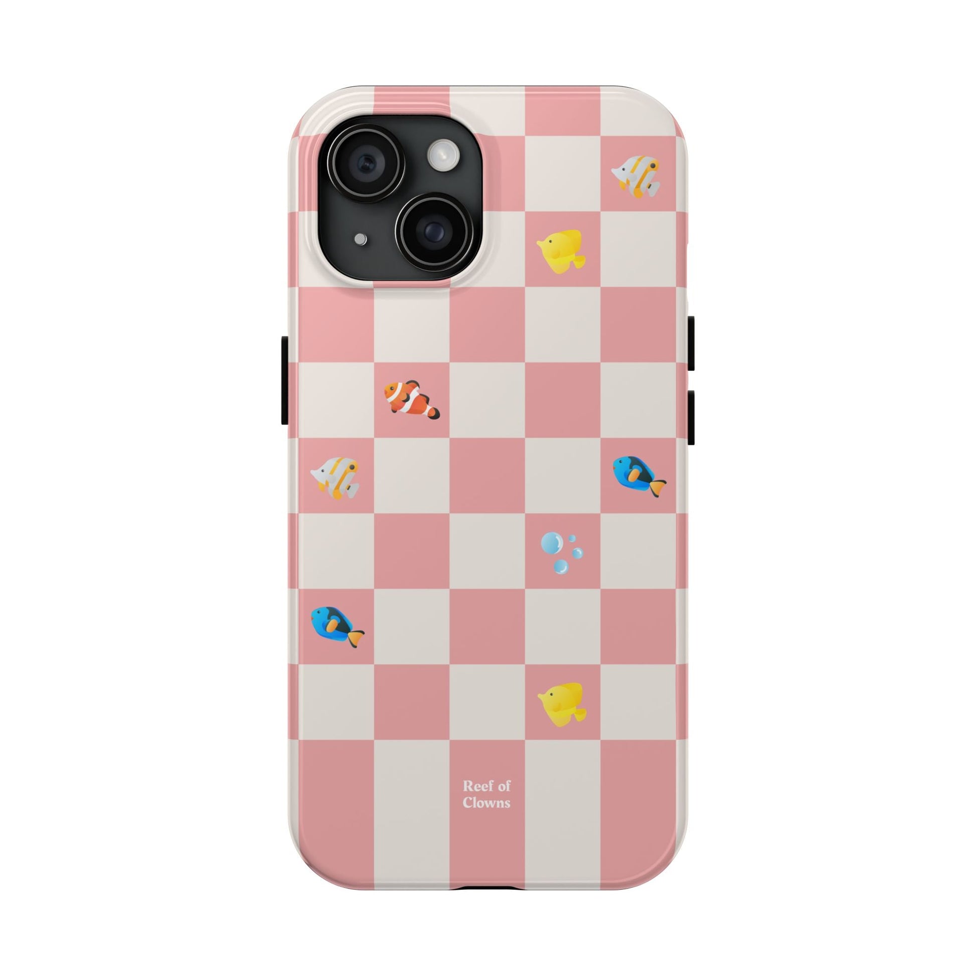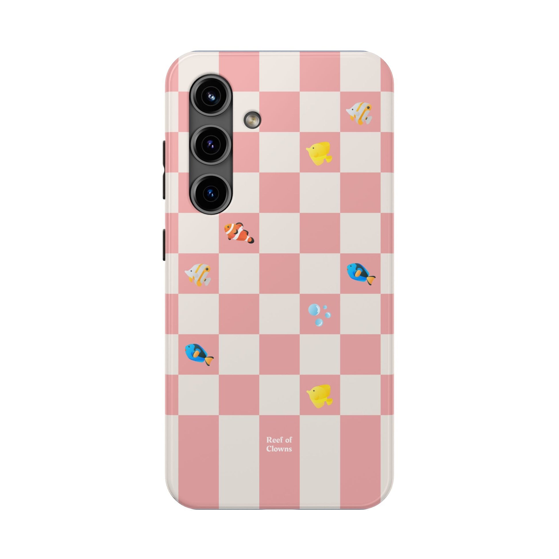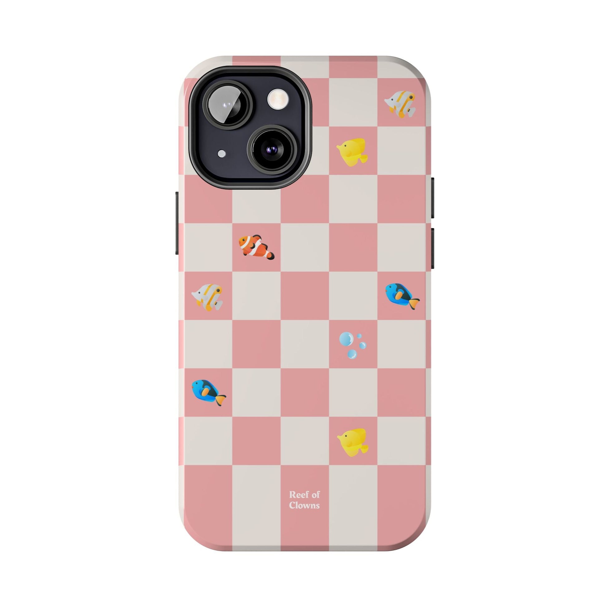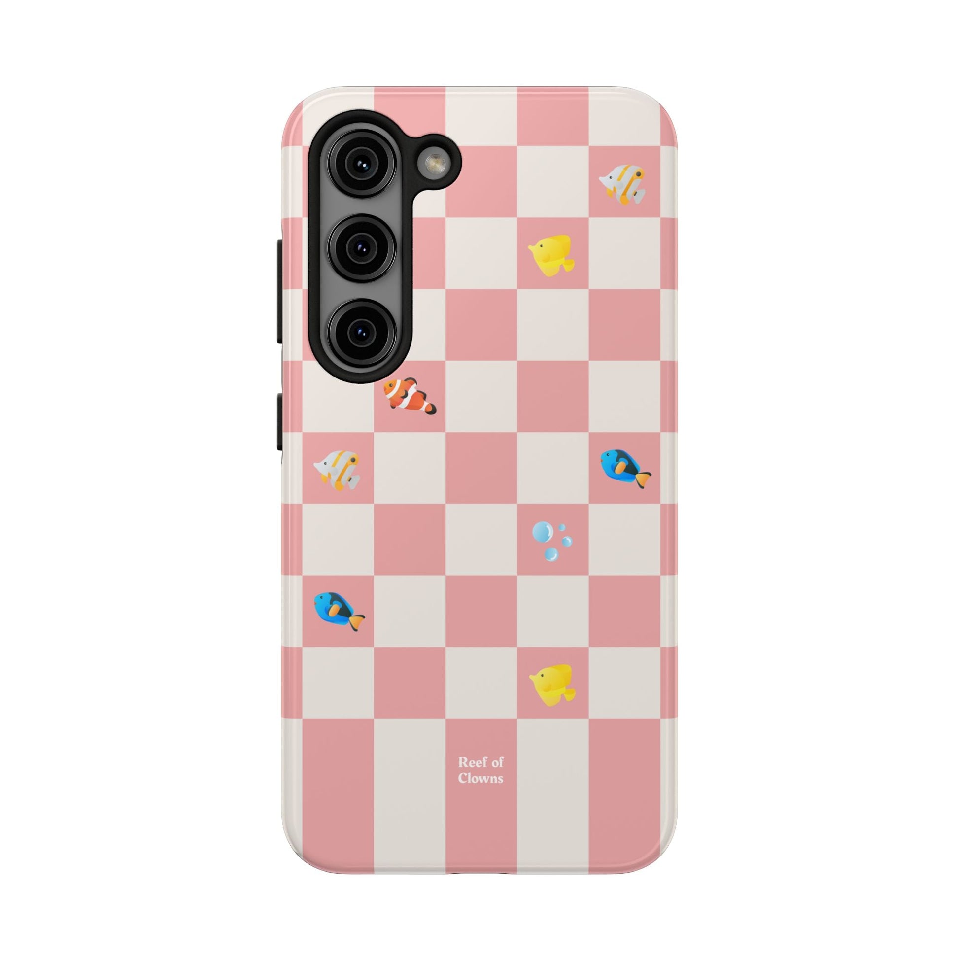 Add a touch of elegance and ocean charm to your phone with the "Reef of Clowns Signature Case" in a rich pinktide checkerboard pattern. Featuring adorable little fishies swimming through the design, this case combines playful marine life with sophisticated style. The slim, durable fit ensures full protection for your phone while the unique design makes it a standout accessory for any ocean lover. Perfect for those who want to keep it classy, cute, and fishy!