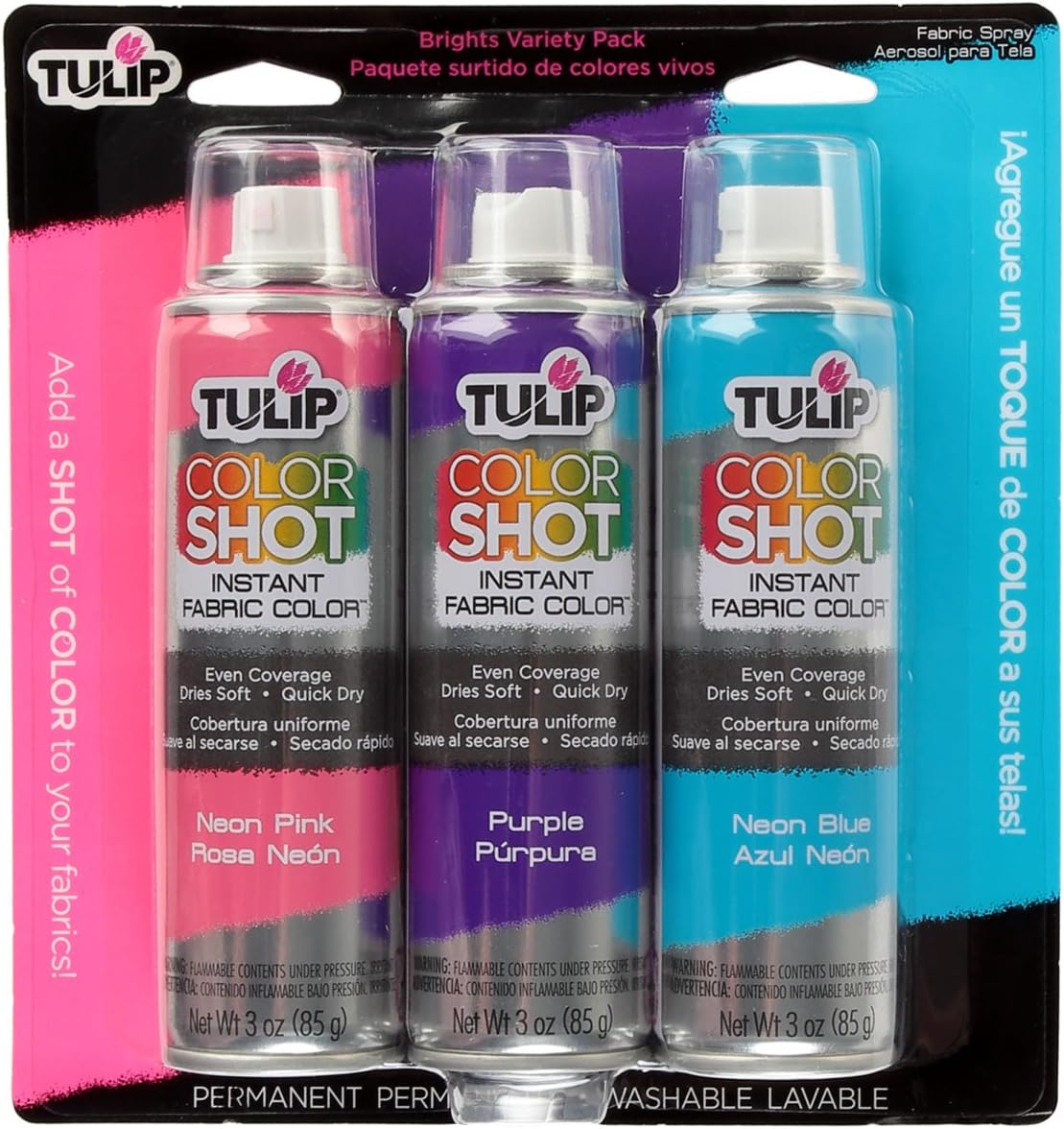 Give your fabrics an instant shot of beautiful, washable, permanent color with Tulip ColorShot Instant Fabric Color. It’s perfect for a dash of color or for allover even coverage, and works wonderfully with stencils and monograms! ColorShot is so easy to use … just shake, aim and spray for gorgeous color in classic, neon and metallic shimmer shades that dry super quick and soft to the touch, without drips or splatters. And it is so easy to blend colors, too! So when your apparel and home décor fabrics need a color renew, refresh or redo, add maximum color appeal with Tulip ColorShot Instant Fabric Color!