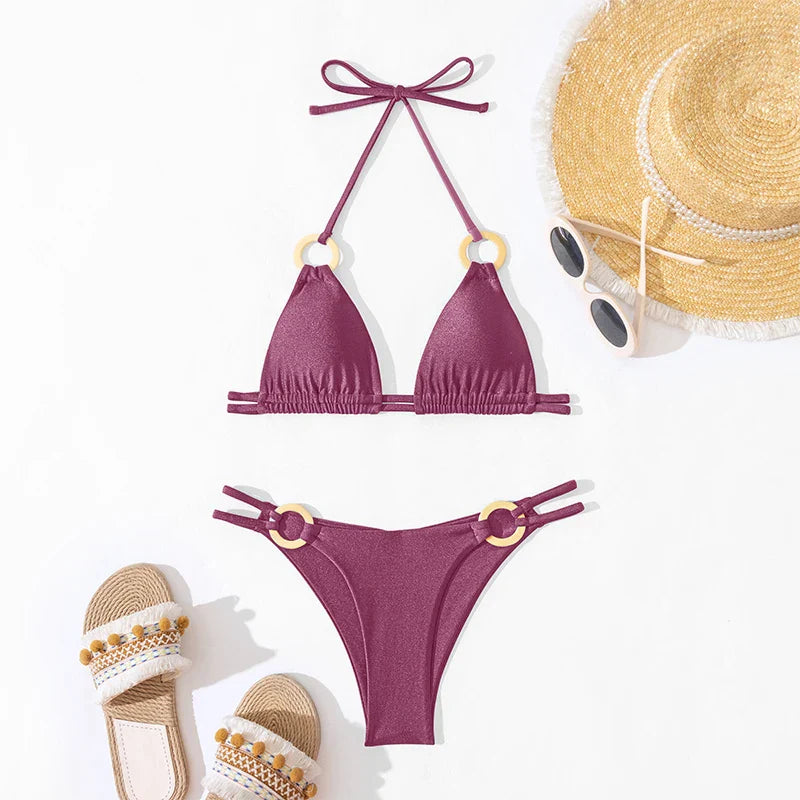 Solid O Ring Swimsuit For Women Tie Side Shiny Metal Hardware Ring Bandeau Bikini