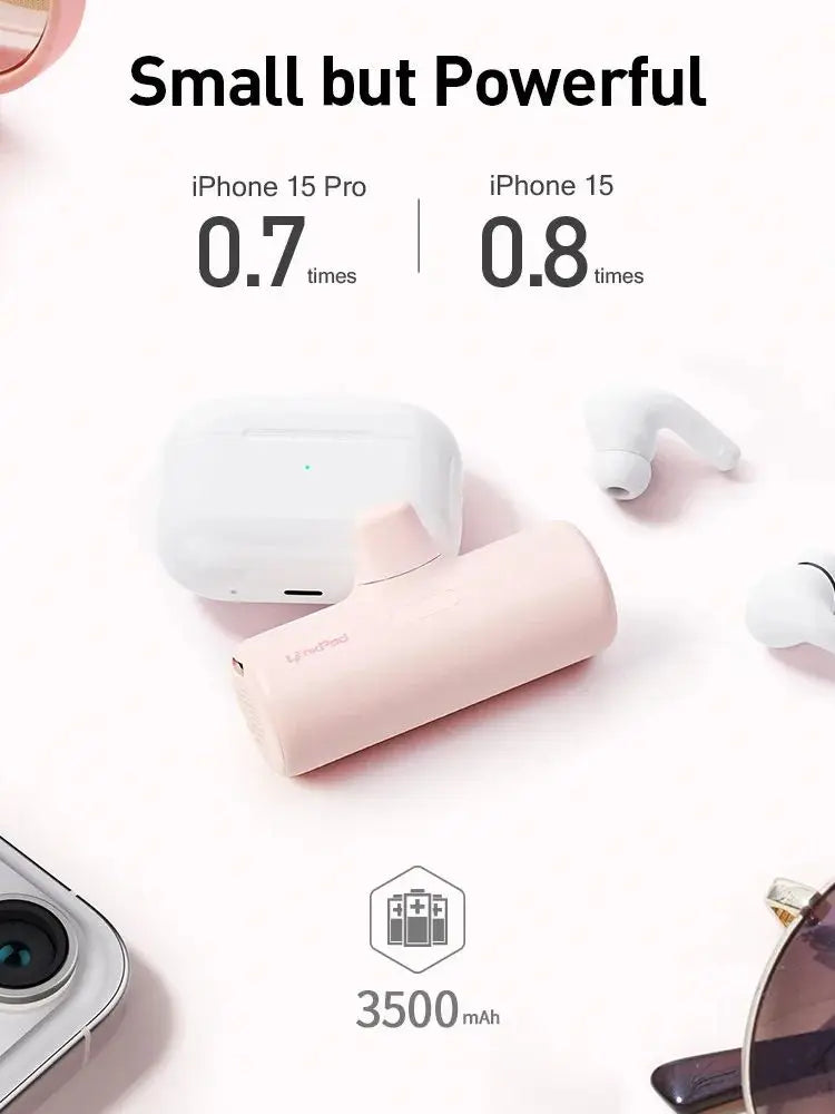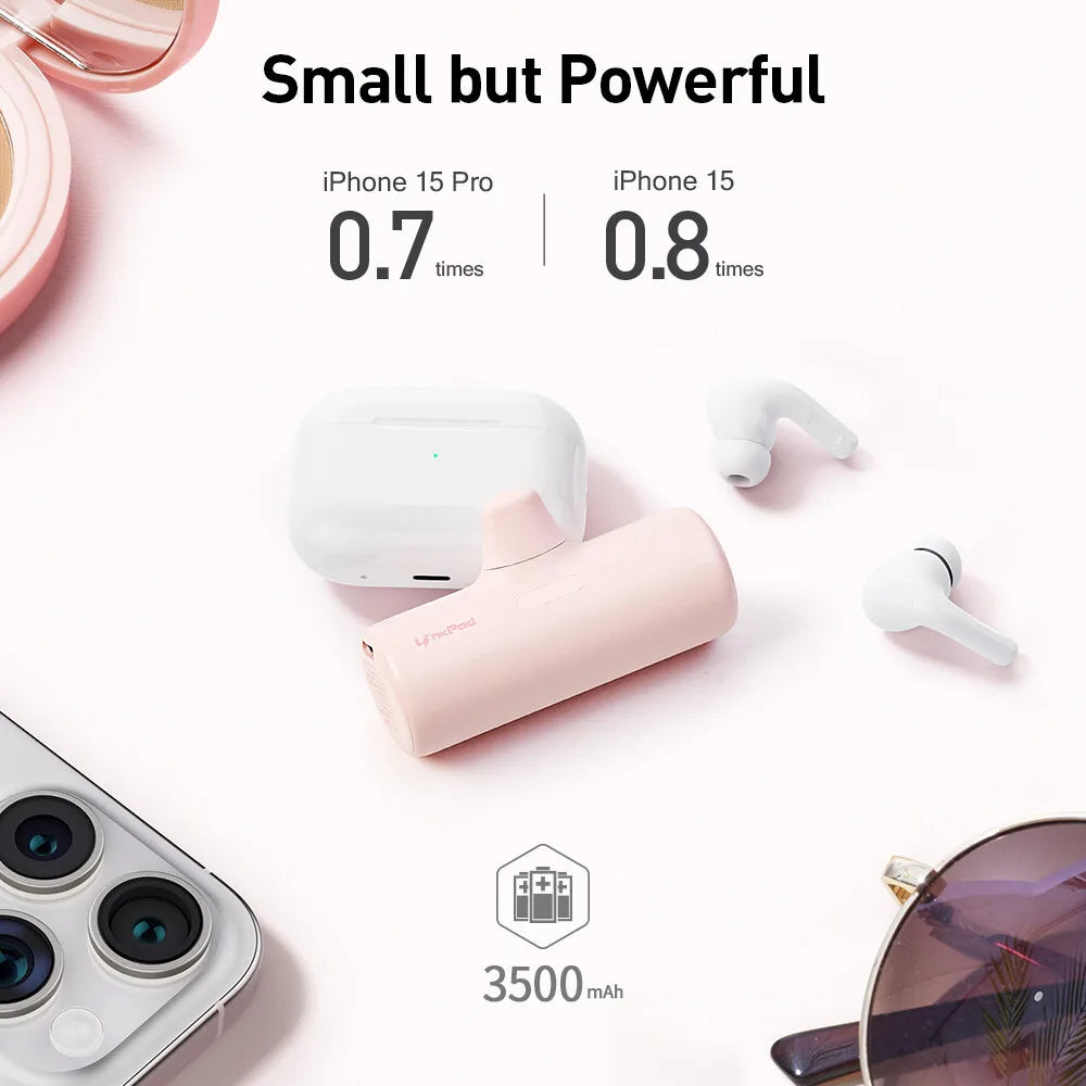 The Mini Portable Capsule Power Bank is a compact and lightweight charging solution, featuring a 3500mAh battery capacity for fast charging on the go. Designed for iPhone users, it comes with a built-in Lightning output and USB Type-C input for easy recharging. Equipped with an LED lamp, this portable power bank is perfect for outdoor use or everyday emergencies.