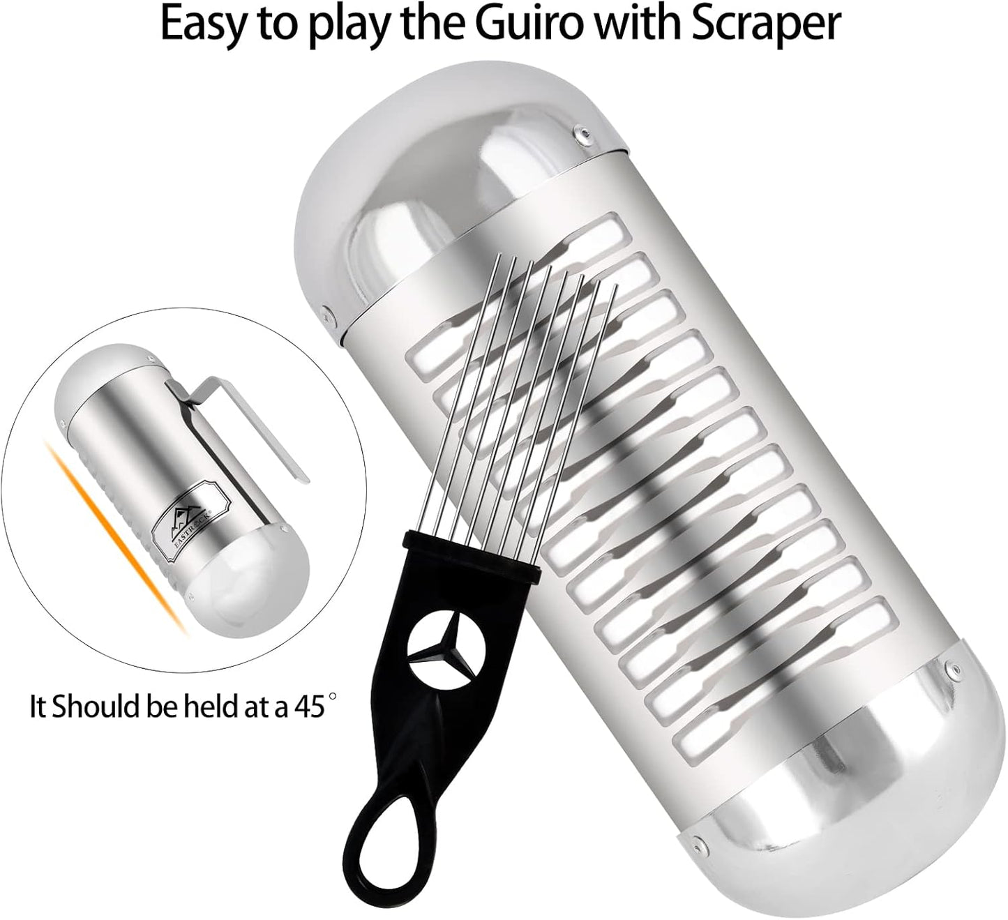About The Product: The Guiro Musical Instruments is a percussion tool used to create rhythmic sounds. It is made of stainless steel, making it strong and long-lasting. This musical tool is perfect for both beginners and experienced musicians. It comes with two scrapers to create different sounds.