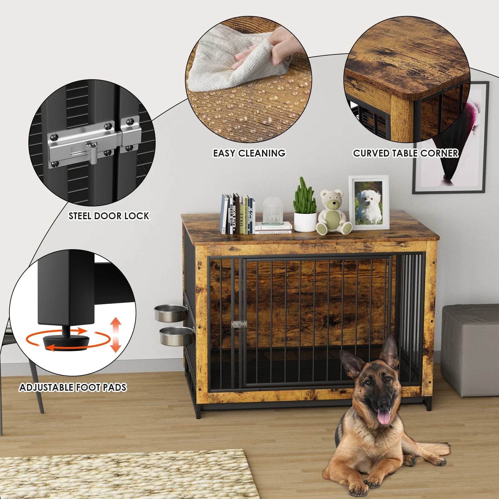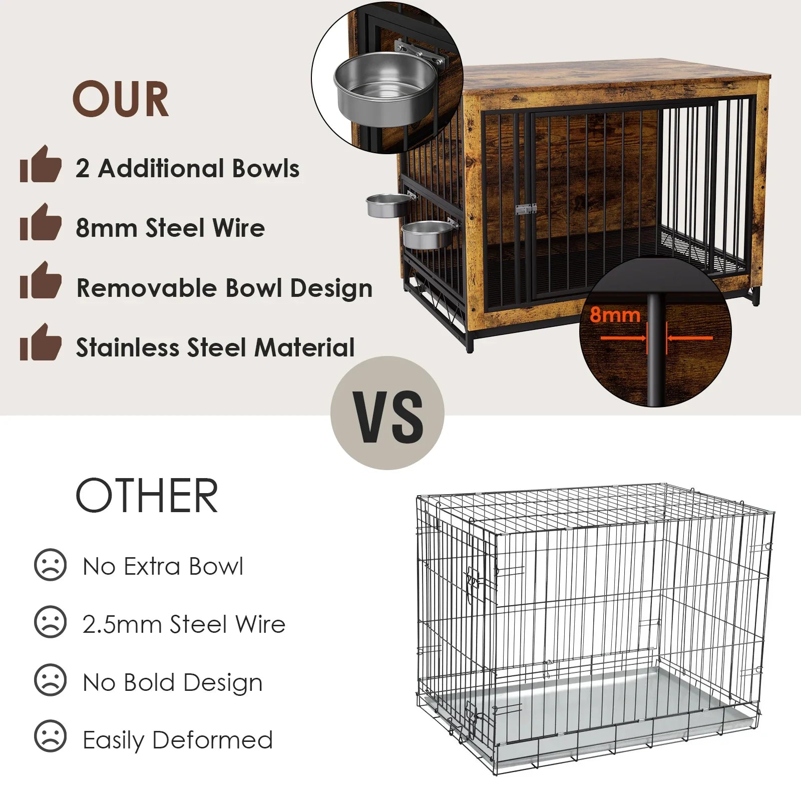 Wooden Dog Crate Furniture with 360°Rotatable Removable Dog Bowls, Dog Crate End Table with Tray, Double Doors Dog Kennels for Medium Dogs Indoor