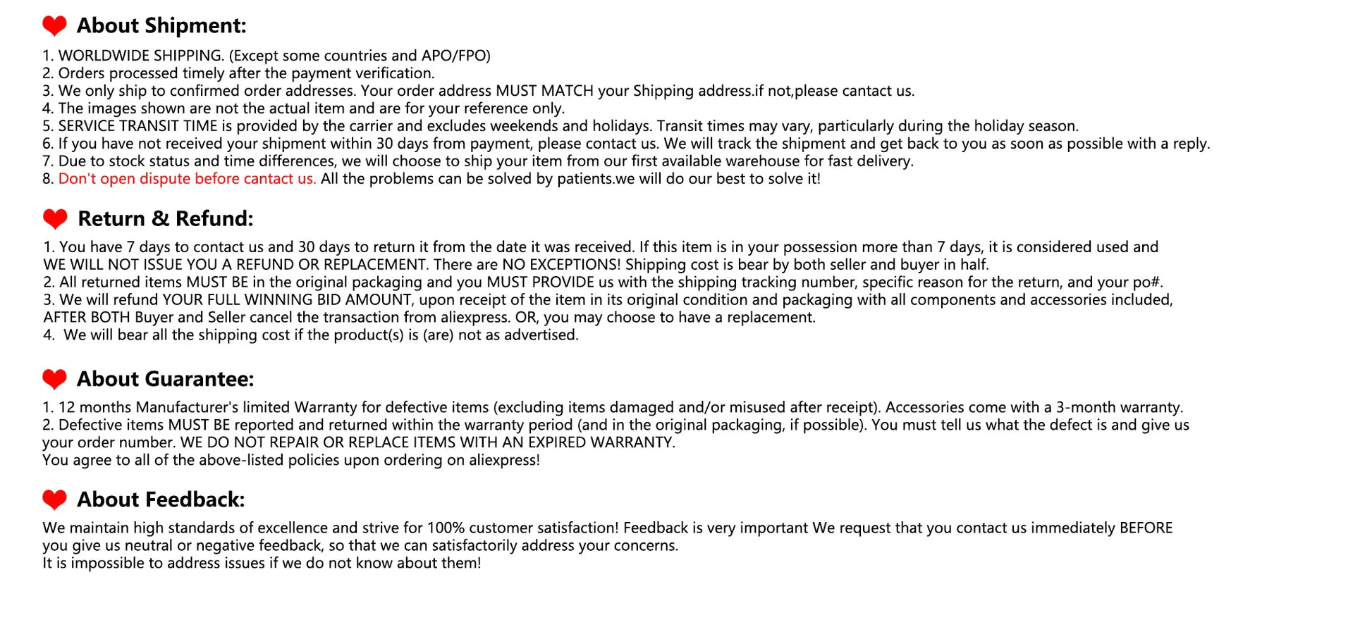 6. Transparent Policies: Our clear return, refund, and shipping policies provide peace of mind, knowing we stand behind our products.